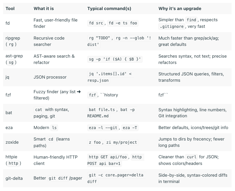 | ripgrep (`rg`) | Recursive code searcher | `rg “TODO”`, `rg -n --glob ‘!dist’` | Much faster than grep/ack/ag; great defaults |